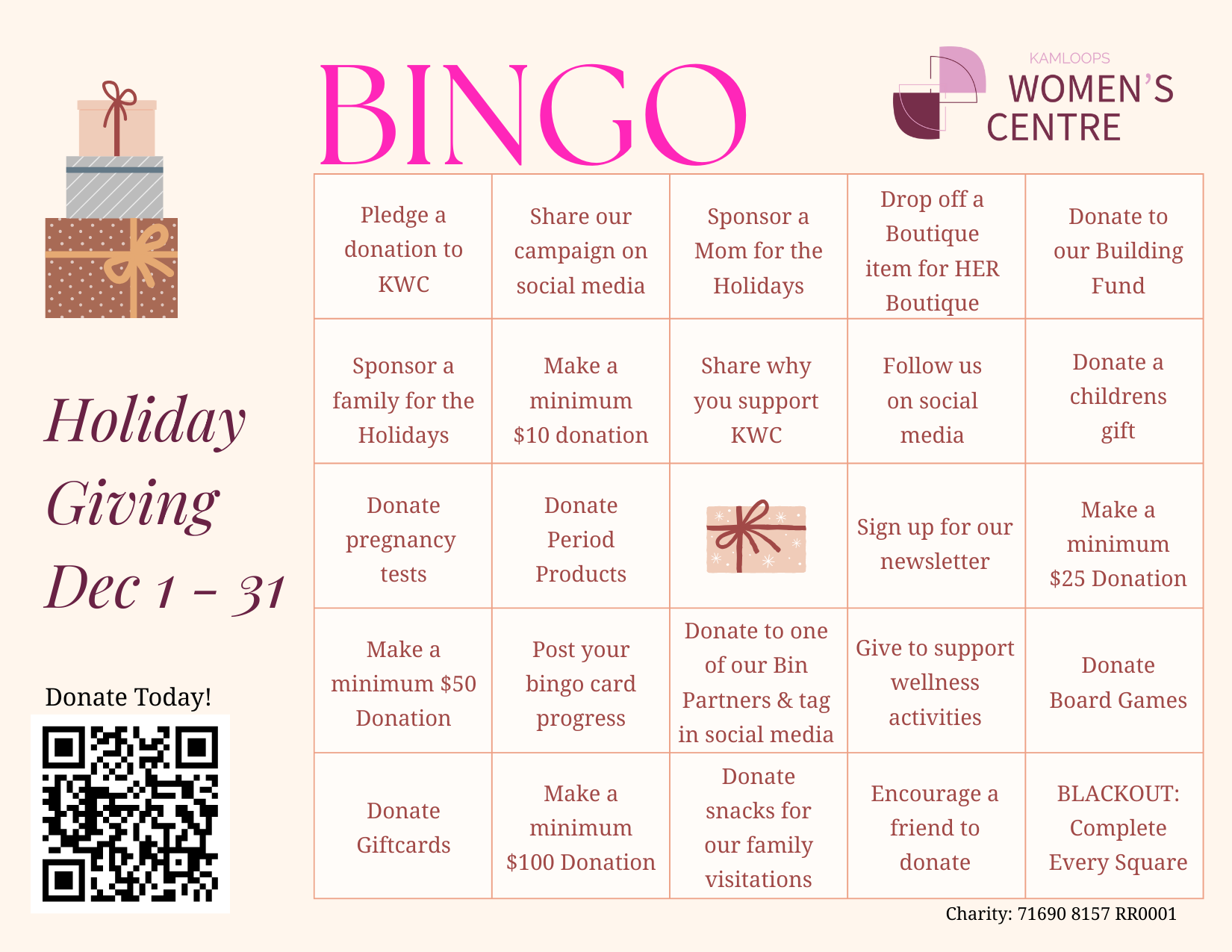 We are kicking off the season with a fun and meaningful way to support women in your community. This BINGO will run from December 1 - 31. Get started early by downloading your PDF Bingo Card, or come pick up a card from the Kamloops Women's Centre.