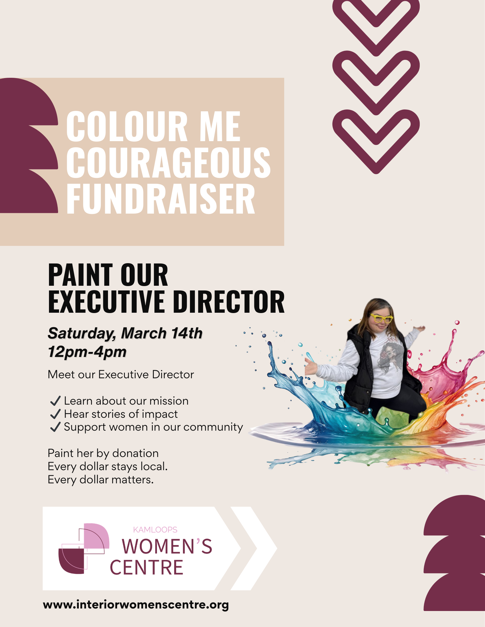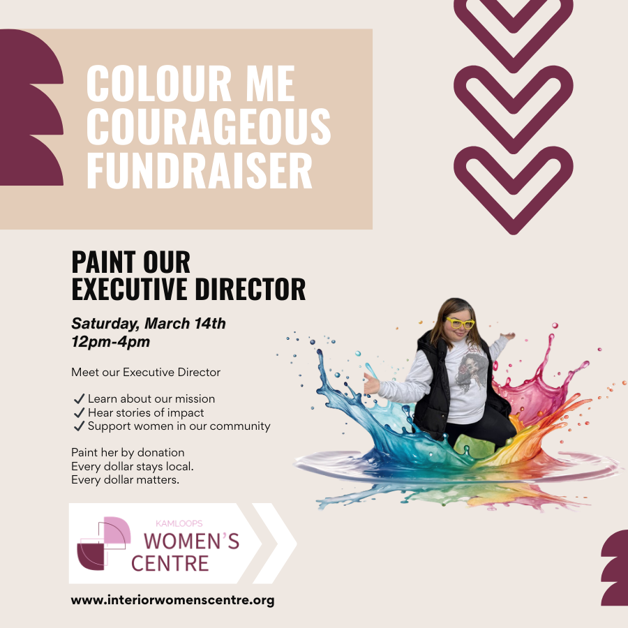 On March 14, the exhibition will feature Colour Me Courageous, a fundraising initiative held in support of women’s programming in Kamloops. By donation, attendees will be invited to participate in a symbolic and light-hearted paint-throwing activity involving the Executive Director. Proceeds from this event will directly support ongoing community initiatives serving women.