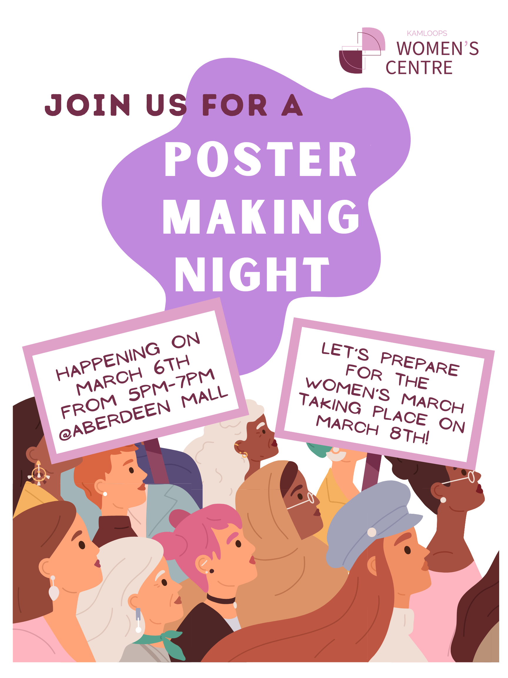 Join us March 6th, 5–7 PM on the upper floor of Aberdeen Mall (next to Marshalls) for an evening of creativity, community, and feminist energy!